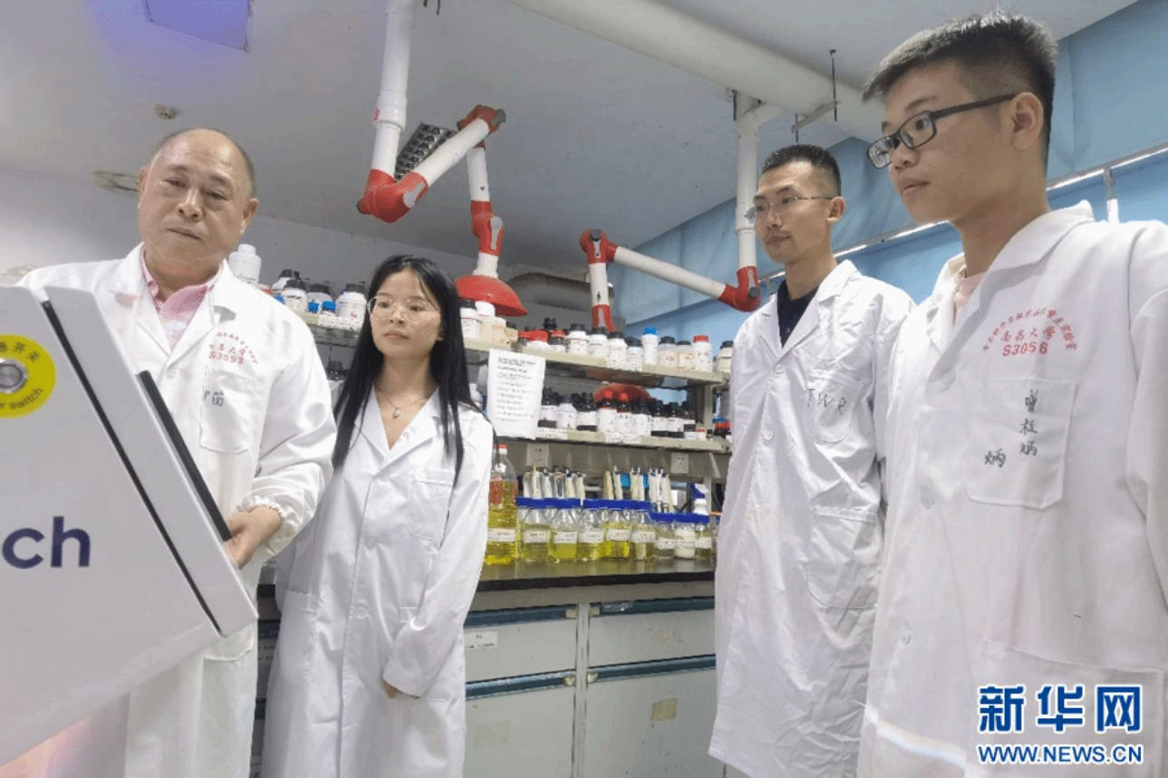曾哲靈(左一)和其“樟樹籽高值化利用技術和產品創制”科研團隊。新華網發